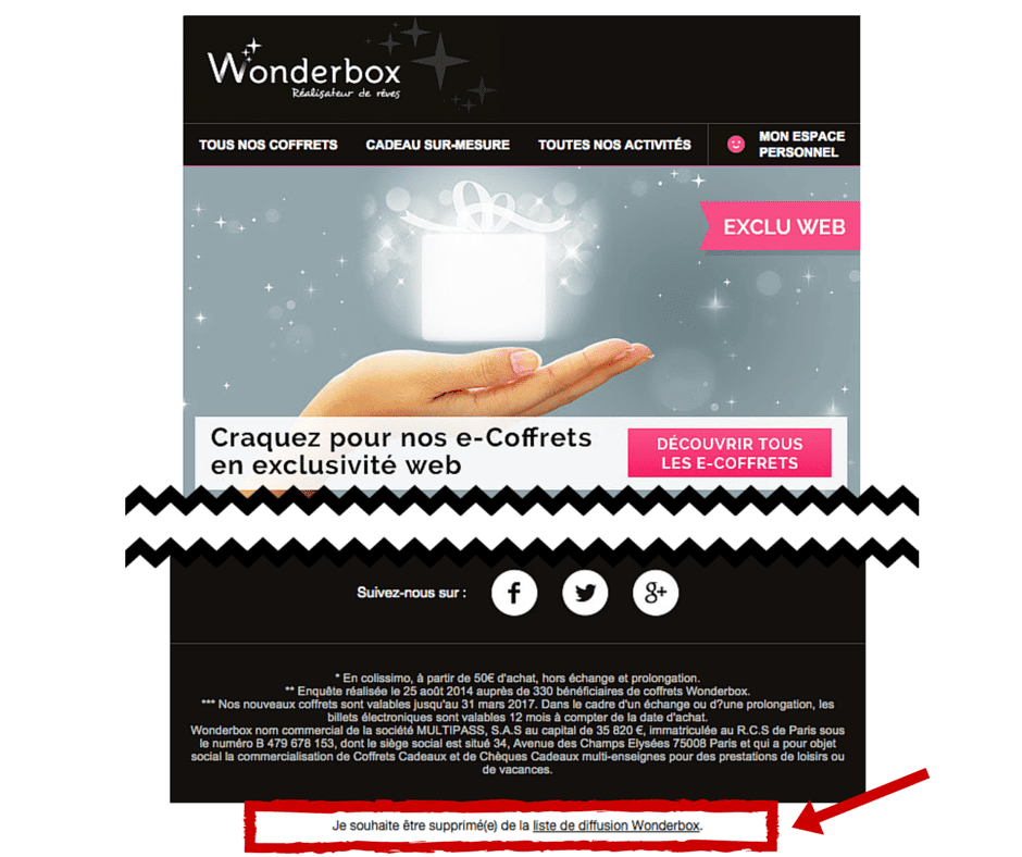 Wonderbox expose ce lien sans ambiguïté sur chacune de ses newsletters.