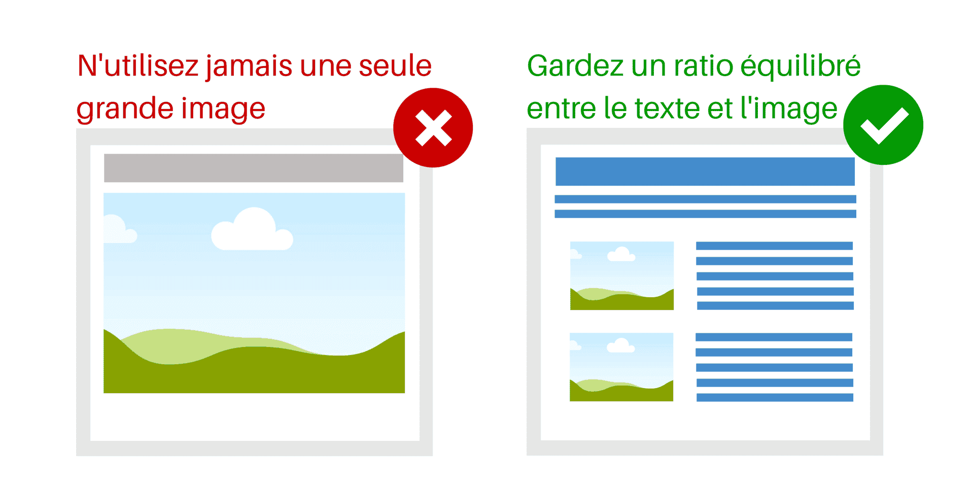 Jouez la carte de l’équilibre : la majorité des messageries masque encore les images par défaut. Ajoutez du texte alternatif pour chaque visuel, et assurez un bon ratio texte/images.